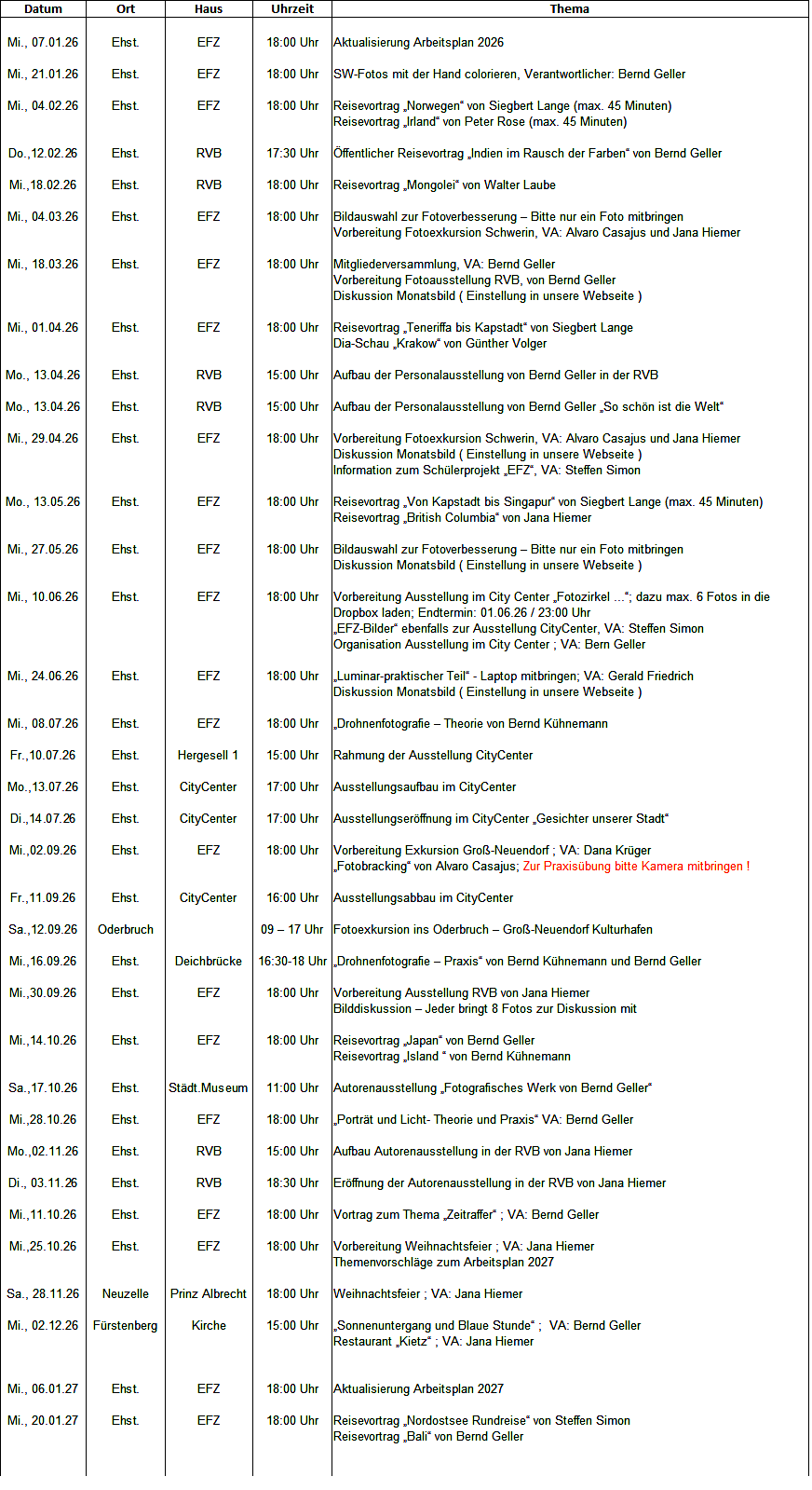 Vorläufiger Terminplan des Fotozirkel EKO e.V. im Jahr 2026: